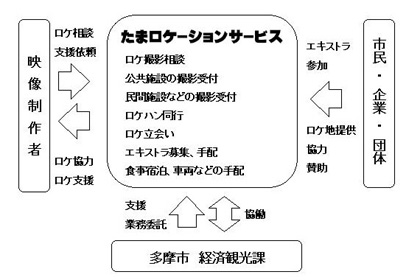 《たまロケ》は、映像製作者の依頼に応じ、ロケ地情報の提供、公共施設の撮影受付や調整のお手伝いをします。 また市民、企業、団体、行政と共に市内の映像制作が円滑に行われるよう全面的に支援します。